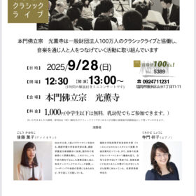 【100万人のクラシックライブ】 光薫寺は一般財団法人100万人のクラシックライブに協力し、音楽を通じ人と人をつなげていく活動を応援しています。 普段…