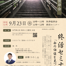 来る9月23日(月・祝)、光薫寺本堂にて「秋季彼岸会」ならびに「終活セミナー」を開催いたします。 午前10時からは秋季彼岸会、11時からは「命の価値を…
