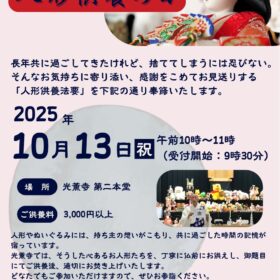 【人形供養の日】 このたび光薫寺では、はじめての「人形供養の日」を奉修いたします。 長年ともに過ごしてきたお人形やぬいぐるみをそのまま処分するのは忍び…