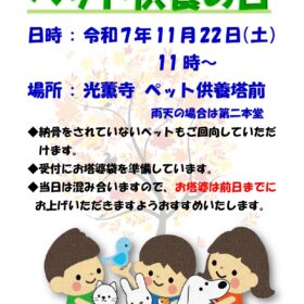 ペットの霊を慰め、感謝の心を捧げる法要です。 光薫寺の信徒でない方もご参詣いただけます。 法要は、山門近くに建立された「ペット供養塔」前にて奉修いたし…