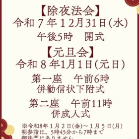 元旦会は、二座に分けて奉修されます。 午前6時 第一座(併・歓信状下附)※お役中の方のお参詣をおすすめします。 午前11時 第二座(併・成人式) どの…