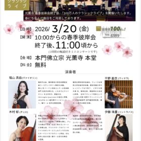 光薫寺は一般財団法人100万人のクラシックライブに協力し、音楽を通じ人と人をつなげていく活動を応援しています。 普段着で聴けるクラシックを身近に体感し…