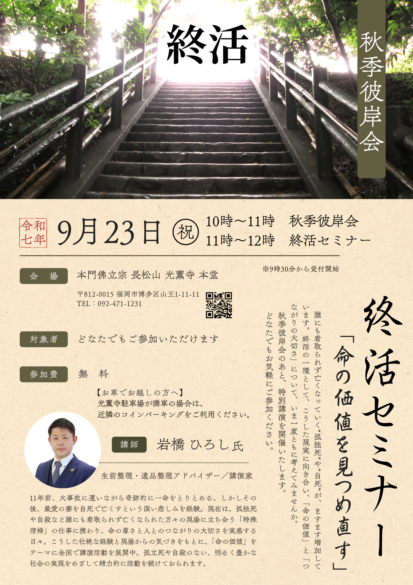 午前10時からは秋季彼岸会、11時からは「命の価値を見つめ直す」をテーマに、生前整理・遺品整理アドバイザーであり講演家の岩橋ひろし氏を講師にお迎えし、終活セミナーを行います。