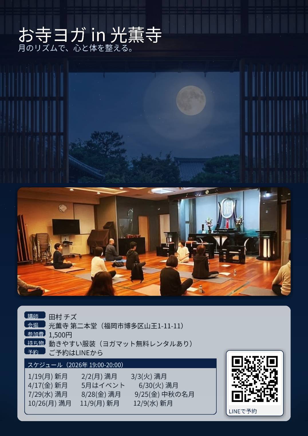 【2026年お寺ヨガ】 今年のお寺ヨガは1/19からスタートです。 毎月、満月か新月の夜に開催します。ハードなヨガではなく、心と体をゆっくりリラックスしていただける内容になっています。 ぜひお越しください。